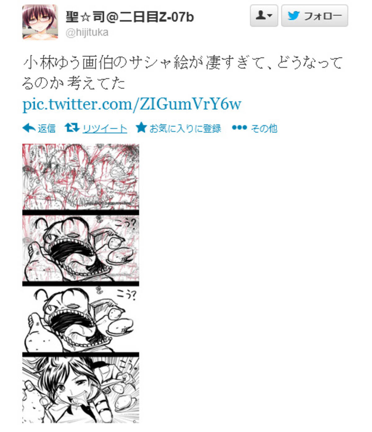 Tweet 小林ゆう画伯の世界観がネットで話題にw衝撃的すぎる 進撃の巨人12話 エンドカード サシャと芋 Naver まとめ