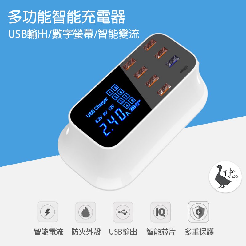 新款8孔智能數位usb 充電器qc3 0 Type C 螢幕顯示快充手機相機平板行動電源防止過充 蝦皮購物