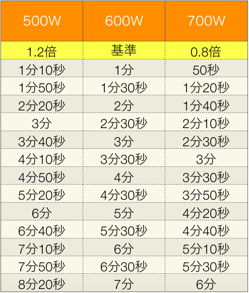 山本ゆり Syunkon レンジは600w On Twitter ワット数が異なるレンジ調理の加熱時間 1分 10分までの早見表です お役に立てれば Syunkonカフェごはん レンジで絶品レシピ より ただし2枚目の説明に書いたように 500wのレンジでもなぜか600w以上のパワーで