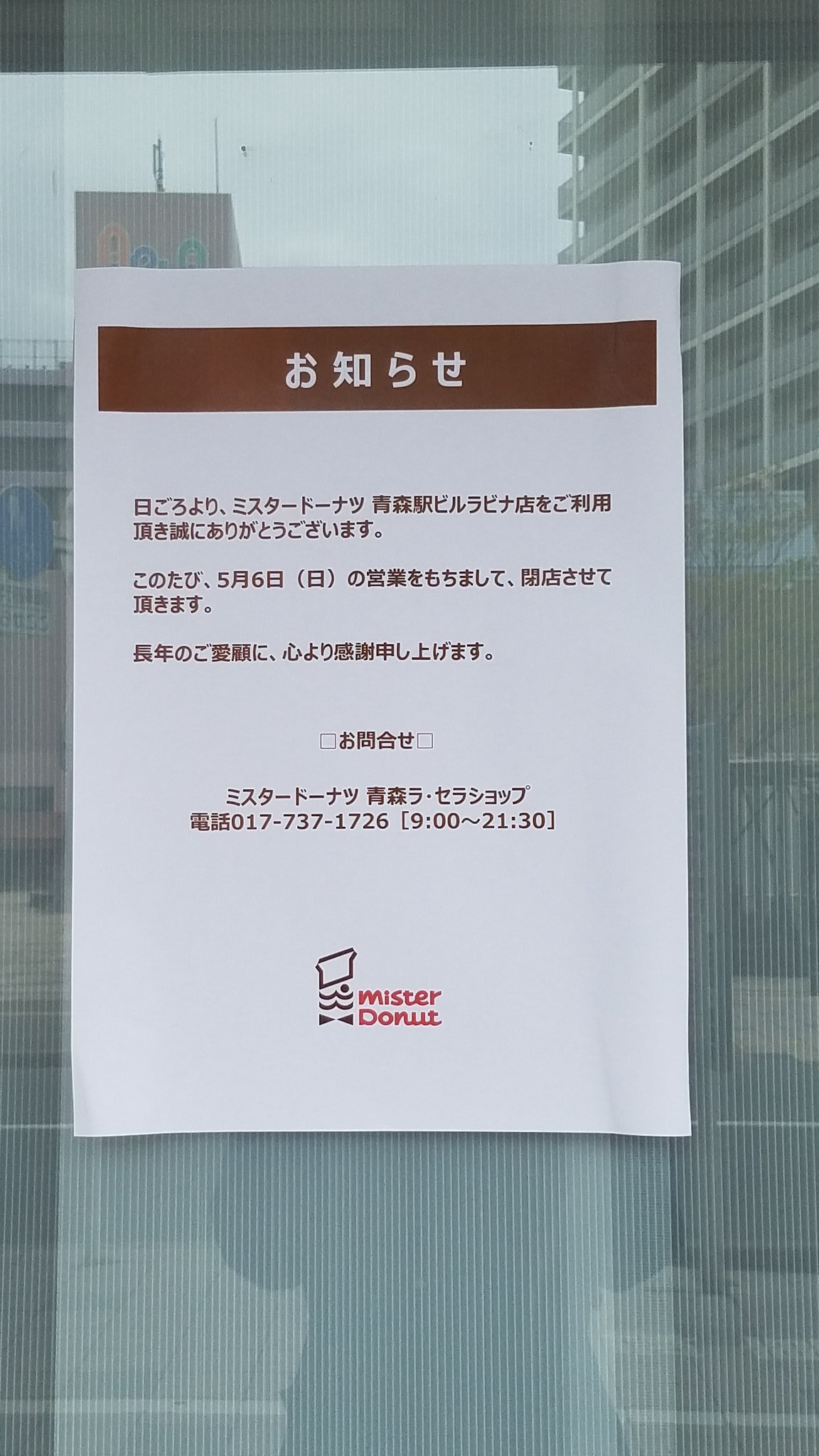 しょー On Twitter 閉店情報 ミスタードーナツ 青森駅ビルラビナ店 5月6日で閉店 平成22年に開店して以来 8年で幕を閉じました