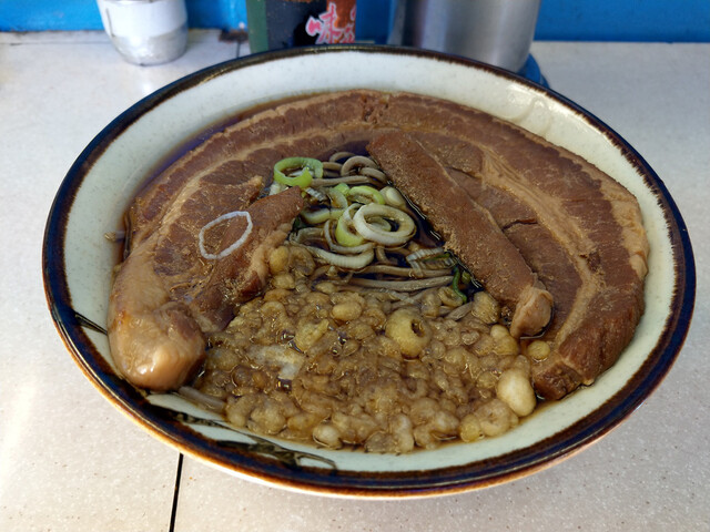 飯田橋立ち食いそば 豊しま で元祖厚肉そば 大盛り 人気朝食 進撃のグルメ デカ盛り メガ盛り 特盛 大盛りetc 世界一のデカ盛り 大盛りグルメサイトを目指しています