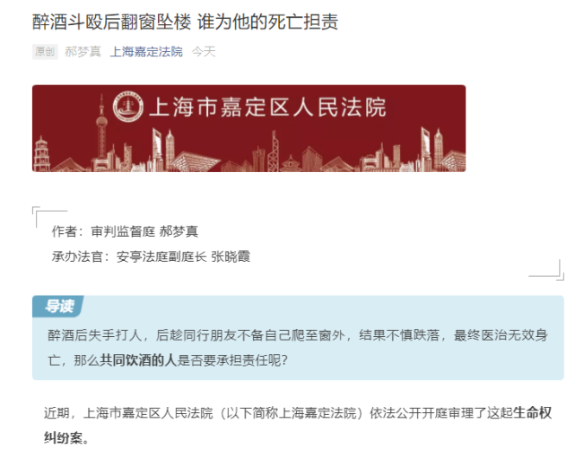 法院判了 男子醉酒后打伤人 又翻窗坠楼1年后身亡 共同饮酒者被判不担责